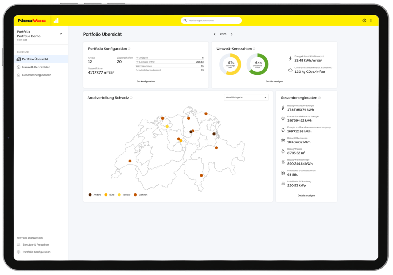 Mit «Monitoring Portfolio» bietet NeoVac eine vollautomatisierte Lösung für ein Umweltcontrolling über gesamte Immobilienportfolios hinweg. Von der Strategieplanung über die Umsetzung und Datenerfassung bis zur Visualisierung und dem Reporting liefern wir alles aus einer Hand.
